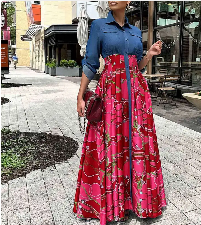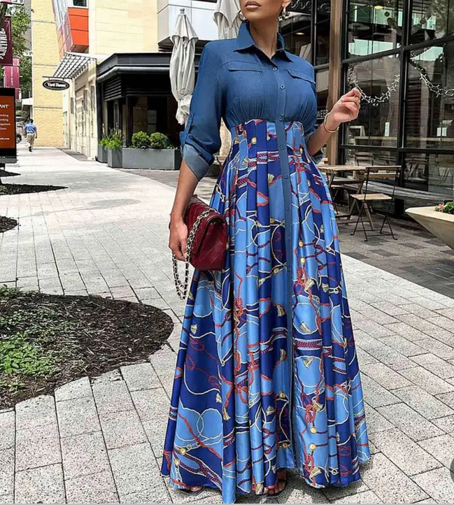 This gorgeous casual denim dress features sophisticated stitching and an eye-catching print, perfect for any occasion. Its comfortable long design combines style with ease, making it an ideal choice for diverse events and daily wear.