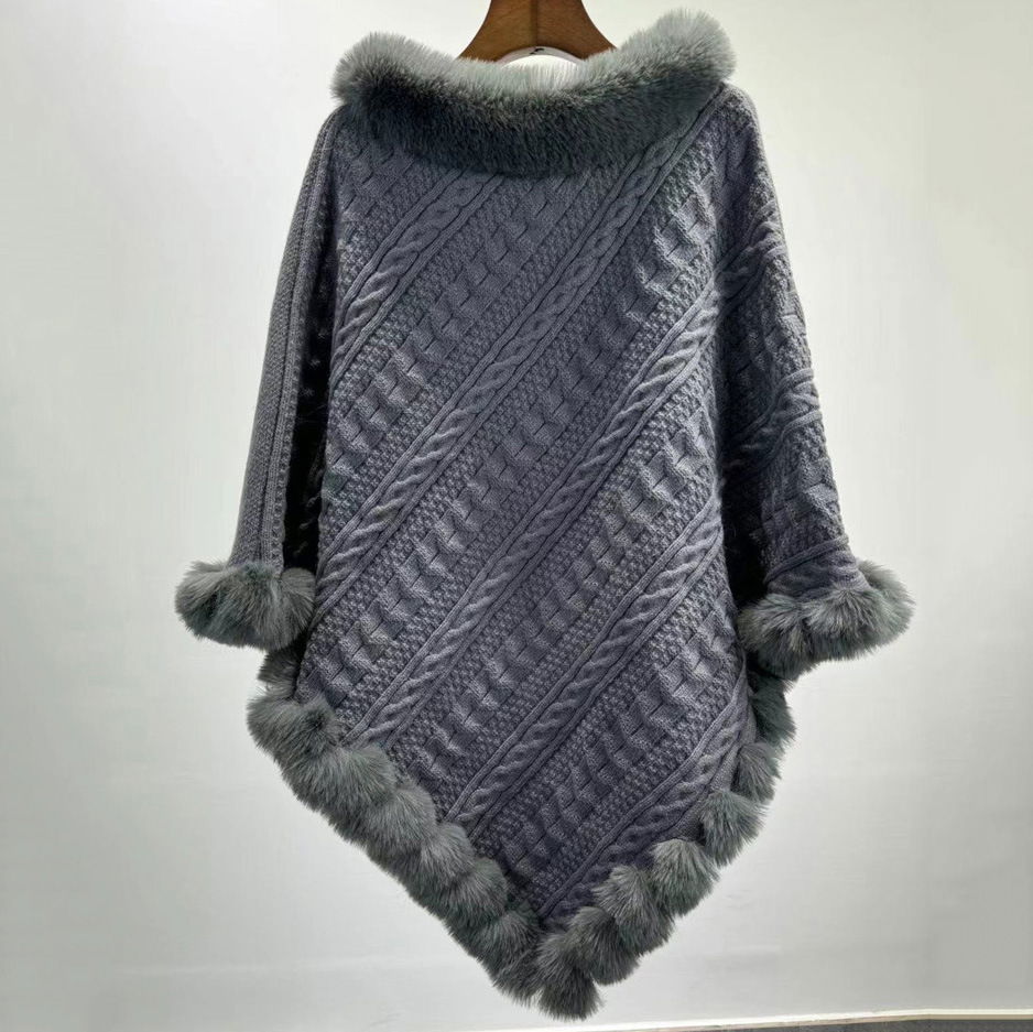 Wrap yourself in cozy luxury with this Fur Collar Oversized Knit Pullover Shawl Cloak – the perfect blend of warmth, style, and effortless elegance for chilly days.